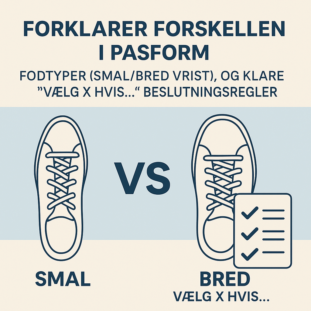 Du får en kort definition af pasform, konkrete “vælg X hvis…”-beslutningsregler, typiske fejl og bedste praksis, samt en jordnær forklaring af, hvorfor nogle fødder trives i en smal læst, mens andre får ondt, når der ikke er nok plads over forfoden eller hen over vristen.